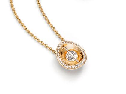 Liberté Arcana: Anhänger aus 750/- Gelbgold (Bügel aus 800/- Platin 200/- Iridium) mit beweglichem Brillant 0,485ct TW si1, Brillant 0,01ct TW if der Unterseite und 30 Brillanten 0,22ct TW vsi am Rand, Ankerkette 42cm mit Karabinerverschluss