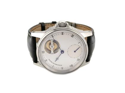 Handaufzugswerk Kaliber SW-07, 46 Stunden Gangdauer, 18.000 A/h, skelettiert, hochfein veredelt, Incabloc-Stoßsicherung, hochwertiges mehrteiliges Edelstahlgehäuse, Durchmesser 42,0 mm, Höhe 10,0 mm, silber-weißes Zifferblatt mit kleiner Sekunde, originales schwarzes Lederarmband mit Faltschließe, Saphirglas, Glasboden, 5 bar wasserdicht