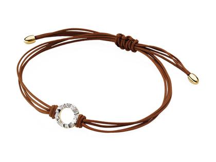 Armband aus 750/- Gelbgold, Alpen 10 mm, mit 11 Brillanten zusammen 0,05 ct TW vsi, Textilband braun