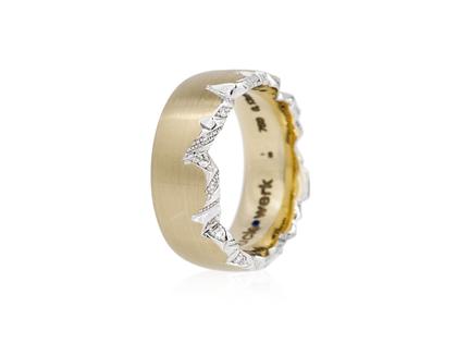 Ring aus 750/- Gelbgold mattiert, gerundete Ringschiene mit "Alpenrelief", mit 21 Brillanten zusammen 0,110 ct TW vsi, 8,0 mm breit, 2,1 mm hoch