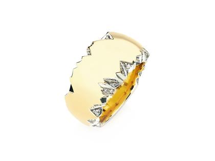 Ring aus 750/- Gelbgold, Verlauf gewölbt, Ringschiene mit "Alpenrelief", mit 50 Brillanten zusammen 0,360 ct TW vsi, 13,0 mm breit