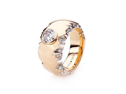 Ring aus 750/- Rotgold, Verlauf gewölbt, Ringschiene mit "Alpenrelief", mit 50 Brillanten zusammen 0,360 ct TW vsi und 1 Solitaire-Brillant 0,400 ct TW vsi, 10,0 mm breit