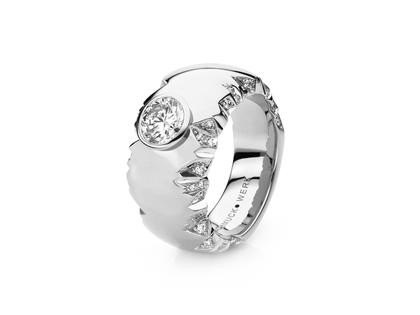 Ring aus 750/- Weißgold, Verlauf gewölbt, Ringschiene mit "Alpenrelief", mit 50 Brillanten zusammen 0,360 ct TW vsi und 1 Solitaire-Brillant 0,400 ct TW vsi, 10,0 mm breit