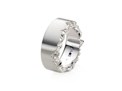 Eine ungewöhnliche Idee, überzeugend umgesetzt: Der Damen- und der Herrenring dieser raffinierten Serie passen in ihrem individuellen Muster direkt ineinander und symbolisieren so die Zusammengehörigkeit. Aber natürlich kann der Ring auch als reiner Schmuckring getragen werden.