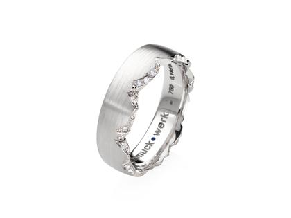Die Idee zur Schmuckwerk Serie Alpen entstand dem Gründer von Schmuckwerk Markus Schmidt während einer Fahrt über den Ärmelkanal. Den beeindruckenden Kreidefelsen der englischen Küste bei Dover wurde mit diesem Schmuckstück ein Denkmal gesetzt und somit hieß die Serie zunächst auch Cliff. Im Laufe der Zeit hat sich aber die Assoziation zu den Alpen und damit auch der neue Name Alpenring durchgesetzt. Ob Kreidefelsen oder die Berge der Alpen – die Schmuckstücke wirken immer wieder raffiniert und einzigartig: Kleine Brillanten funkeln in der Kante und sorgen für ein aufregendes Erscheinungsbild.
