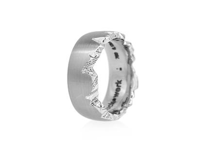 Ring aus 750/- Weißgold mattiert, gerundete Ringschiene mit "Alpenrelief", mit 21 Brillanten zusammen 0,110 ct TW vsi, 8,0 mm breit, 2,1 mm hoch