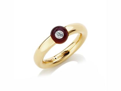 Spannring-Kugelring aus 750/- Gelbgold, Breite 4,2 mm, 6 mm Glaskugel braun eingefärbt mit Brillant weiß 0,06 ct TW vsi