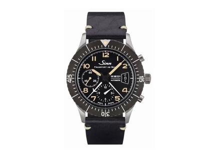 Der springende 60-Minuten-Stoppzeiger in der Mitte ist hier ein markantes und praktisches Erkennungszeichen. Stoppzeiten lassen sich somit einfacher und genauer erfassen. Dieses Werk ist in ein neu konstruiertes Gehäuse mit Schraubboden integriert, das sich ästhetisch an den historischen Vorbildern mit Stülpgehäuse orientiert. Das neuen Modell besitzt nun ein Deckglas aus Saphirkristall, welches entgegen dem Acrylglas bei Ursprungsmodell mit einer höheren Kratzfestigkeit punkten kann. Der Fliegerdrehring ist unverlierbar mit dem Gehäuse verbunden und ohne Rastung gleitend drehbar – eine weitere Innovation, die in dieser Form erstmals bei SINN zu finden ist.