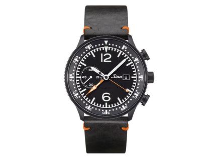 Automatik, Sinn-Chronographen-Uhrwerk SZ01, Edelstahl mit schwarzer Hartstoffbeschichtung auf tegimentiertem Untergrund, Gehäusedurchmesser 45 mm, mattschwarzes Zifferblatt, Ziffern und Indizes mit Leuchtfarbe belegt, schwarzes Vintage-Lederband, Saphirglas, verschraubter Boden, 20 bar wasserdicht, Ar-Trockenhaltetechnik, dadurch erhöhte Funktions- und Beschlagsicherheit
