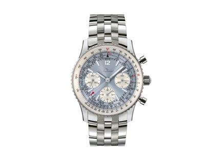 Automatikwerk LJP L110 mit einer Gangreserve von 60 Stunden, Schaltradchronograph fein veredelt, poliertes und satiniertes Edelstahlgehäuse im Durchmesser von 41,0 mm, Höhe 14,5 mm, Drehring mit Rechenschieberfunktion aufgrund logarithmischer Skaleneinteilung, verschraubte Krone, hellblaues Sonnenschliff-Zifferblatt, Indizes und Zeiger mit Leuchtfarbe, 30-Minuten-Zähler auf 3 Uhr, 12-Stunden-Zähler auf 6 Uhr, kleine Sekunde auf Uhr 9 Uhr, Edelstahlarmband mit Faltschließe, zusätzliches braunes Pferdelederarmband mit weißer Kontrastnaht und Dornschließe, Saphirglas entspiegelt, verschraubter Edelstahl-Gehäuseboden mit Saphirglas-Einsatz, 20 bar wasserdicht, unterdrucksicher - limitiert auf 500 Exemplare