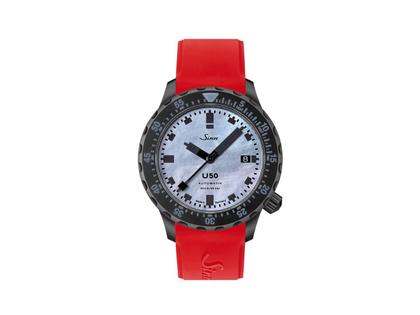 Sinn Spezialuhren U50 S Taucheruhr Automatik U‑Boot‑Stahl 41mm Perlmuttzifferblatt rotes Silikonband