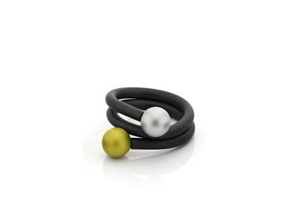 Ring zweireihig aus schwarzem Kautschuk mit 2 gebürsteten Aluminium-Kugeln in Grün und Silber