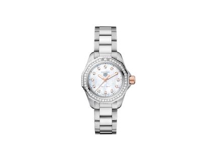 Funkelnde Edelsteine und strahlend weißes Perlmutt verzieren diese prestigeträchtige TAG Heuer Aquaracer mit 30 mm Durchmesser. Ihr fein gearbeitetes und dennoch widerstandsfähiges Design ist jeder Herausforderung mit absoluter Raffinesse gewachsen.