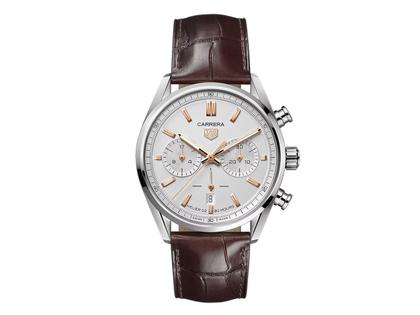 TAG Heuer Carrera Chronograph Automatik Edelstahl 42mm silbernes Zifferblatt braunes Lederband