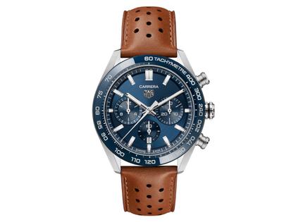 TAG Heuer Carrera Chronograph Automatik Edelstahl 44mm blaues Zifferblatt braunes Lederband