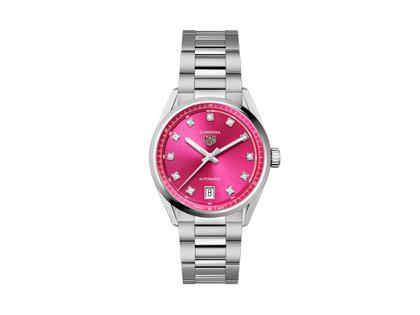TAG Heuer Carrera Date Automatik Edelstahl 36mm pinkes Zifferblatt mit Brillanten Metallband
