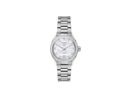 Das elegante Zifferblatt aus Perlmutt ist geschmückt von 11 Diamanten mit einem Durchmesser von 1,30 mm (0,088 ct) auf den Indizes und einer luxuriösen Lünette aus poliertem Edelstahl mit 56 Diamanten mit einem Durchmesser von 1,40 mm (0,544 ct). Das raffinierte 29-mm-Gehäuse verfügt über einen transparenten Gehäuseboden aus Saphirglas, der den Blick auf das Uhrwerk freigibt. Garantierte Wasserdichtigkeit bis 100 Meter. Das elegante „H-förmige“ Armband aus Edelstahl wird von einer Faltschließe aus Edelstahl mit appliziertem TAG Heuer Logo und doppelten Sicherheitsdrückern am Handgelenk gehalten.