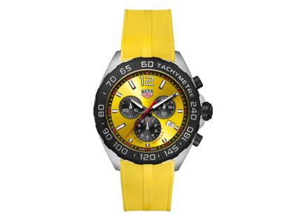 Die TAG Heuer Formula 1 gibt mit Farbe und Frische das Tempo vor. Als vielseitiger 43-mm-Chronograph mit leuchtend gelben Zifferblatt und passendem Kautschukarmband in sportlichem Design ist die Motorsport-Kollektion auf dem Weg zum Sieg. Energiegeladen und lebendig ist die TAG Heuer Formula 1 perfekt für das schnelllebige Leben.