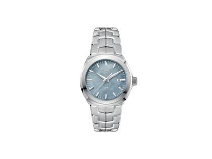 runde Quarz Damenuhr mit einem Edelstahlgehäuse im Durchmesser von 32 mm, blaues Perlmutt-Zifferblatt mit Datumsanzeige auf 3 Uhr, Edelstahlarmband mit Faltschließe, Saphirglas, 10 bar wasserdicht