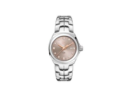 Eine trendige Link Lady Quarzuhr mit einem schlanken 32 mm Gehäuse aus Edelstahl. Die grau-braunen Schattierungen des taupefarbenen Zifferblatts mit Sonnenschliff changieren mit jeder Bewegung des Handgelenks. Leuchtende Details aus Roségold ergänzen den luxuriösen Look. Die schimmernden Oberflächen des Gehäuses und der Lünette aus Edelstahl bilden die perfekte Kulisse für die edlen, runden Diamanten. Ein besonders robustes Saphirglas sorgt für den ultimativen Schutz. Die Wasserdichtigkeit ist bis zu einer Tiefe von 100 Metern garantiert.