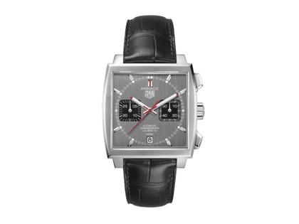 TAG Heuer Monaco Chronograph Automatik Edelstahl 39mm graues Zifferblatt schwarzes Lederband