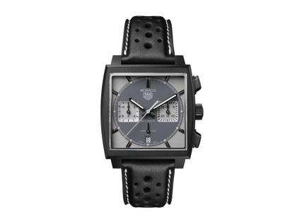 Automatik Chronograph, Calibre Heuer 02, 80 Stunden Gangreserve, markantes perlgestrahltes Titangehäuse - Titan Grad 2 , schwarz DLC beschichtet, quadratisch, 39 mm x 39 mm, graues, opalisierendes Zifferblatt (sandgestrahlt), außen blau nachleuchtend, schwarzes Lederband mit schwarzer Titan-Faltschließe, gewölbtes Saphirglas, Glasboden, 10 bar wasserdicht