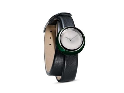 Quarzwerk, Edelstahlgehäuse im Durchmesser von 27,0 mm, Gehäusekörper aus grüner Kunststoffkugel, silberfarbenes Zifferblatt, silberfarbene Zeiger, schwarzes Lederarmband mit Dornschließe, Mineralglas, 3 bar wasserdicht