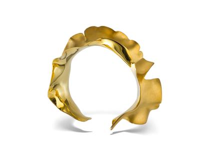 Armspange aus 950/- Silber rhodiniert und mit 750/- Gelbgold vergoldet, mattiert und poliert, geschwungene asymetrische Form, 1,0 - 4,5 cm im Verlauf breit, Größe S/M