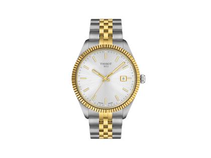 Die Tissot Ballade 40mm wurde für besondere Momente designt, um Ihrem Stil in solchen das ganz besondere Etwas zu verleihen. Ihr traditionelles Zifferblatt mit Sonnenstrahl-Effekt reflektiert das Licht auf wundervolle Weise und verleiht der Uhr Tiefe und Eleganz. Die kannelierte Lünette steht als raffinierte Verzierung für traditionelle Uhrmacherkunst. Ein dank Schnellwechselsystem werkzeuglos austauschbares Armband bietet maximale Vielseitigkeit und ermöglicht es Ihnen, Ihren Look unkompliziert zu verändern. Diese Ausführung der Tissot Ballade 40mm besitzt ein 40 mm messendes 316L-Edelstahlgehäuse in Bicolor mit gelbgoldfarbener PVD-Beschichtung. Kratzfestes, entspiegeltes Saphirglas liegt schützend über dem silberfarbenen Zifferblatt, das über eine Datumsanzeige bei 3 Uhr verfügt. Gelbgoldfarbene Zeiger und Indizes heben sich kontrastreich vom Zifferblatt ab, und ihre SuperLuminova® Leuchtbeschichtung gewährt beste Ablesbarkeit. Im Inneren der Uhr schlägt ein präzises Swiss Made Quarzwerk mit Anzeige des Endes der Batterielebensdauer (EOL (End of Life)-Funktion). Das ebenso massive wie flexible 316L-Edelstahlarmband – ebenfalls in Bicolor mit gelbgoldfarbener PVD-Beschichtung – besitzt eine Butterfly-Faltschließe mit Drückern und hält die Tissot Ballade 40mm sicher am Handgelenk.