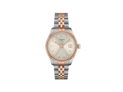 Die Tissot Ballade ist die neu aufgelegte, weiterentwickelte Version eines Modells, das tief in der Tissot Historie verankert ist. Markante Details – allen voran die kannelierte Lünette – verleihen der Ballade ihre außergewöhnliche Identität. Diese Uhr geht mit der Zeit und bleibt ihrer Designsprache dennoch treu. Als vielseitige Bereicherung hat sie ihren festen Platz in der Tissot Kollektion. Diese Ausführung der Tissot Ballade 34mm besitzt ein präzises Quarzwerk und ein 316L-Edelstahlgehäuse in Bicolor mit roségoldfarbener PVD-Beschichtung. Kratzfestes, entspiegeltes Saphirglas liegt schützend über dem silberfarbenen Zifferblatt mit Sonnenstrahl-Effekt und Datumsanzeige, von dem sich roségoldfarbene Zeiger und Indizes dezent abheben. Das ebenso massive wie flexible 316L-Edelstahlarmband – ebenfalls in Bicolor mit roségoldfarbener PVD-Beschichtung – verfügt über eine Butterfly-Faltschließe mit Drückern und hält die Uhr sicher am Handgelenk. Dank Schnellwechselsystem lässt es sich ganz einfach und werkzeuglos gegen ein anderes passendes Armband austauschen.
