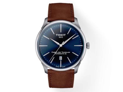 Tissot Chemin des Tourelles Powermatic 80 Automatik Edelstahl 42mm blaues Zifferblatt braunes Lederband