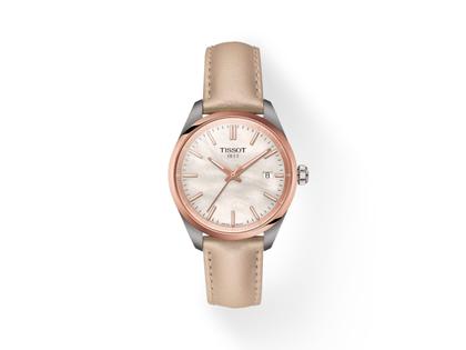 Tissot PR 100 Quarz Edelstahl 34mm weißes Perlmutt-Zifferblatt cremefarbenes Lederband