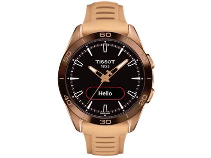 Schweizer Connected-Quarzwerk mit taktiler Bedienung, hypoallergenes Titangehäuse Roségoldfarben-PVD beschichtet im Durchmesser von 43,75 mm, Höhe 13,5 mm, kratzfeste braune Keramiklünette, AMOLED-Touchdisplay, schwarzes Zifferblatt mit Zeigern und Indizes sowie einer digitalen Anzeige, angetrieben von Solarenergie, Ewiger Kalender, beiges Silikonband mit Titan-Dornschieße und Schnellwechselsystem, kratzfestes, entspiegeltes Saphirglas, Titangehäuseboden mit integrierten Sensoren, 5 bar wasserdicht