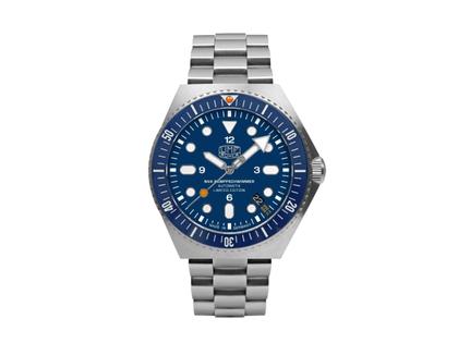 Automatikwerk Seiko NH35A, poliertes Edelstahlgehäuse im Durchmesser von 42,0 mm, Höhe 15,0 mm, einseitig drehbare Edelstahl-Lünette mit blauer Keramik-Einlage, blaues Zifferblatt, Datumsanzeige zwischen 4 und 5 Uhr, silberfarbener Stunden- und Minutenzeiger mit weißer Super-LumiNova Leuchtmasse, silberfarbener Sekundenzeiger mit orangefarbenem Super-Lumiova Leuchtpunkt, silberfarbene Indizes mit weißer Super-LumiNova Leuchtmasse, weiße Minüterie auf blauem Zifferblatt-Außenring, poliertes mehrgliedriges Edelstahlarmband mit Faltschließe, Edelstahl-Gehäuseboden, Saphirglas, 20 bar wasserdicht - limitiert auf 499 Exemplare