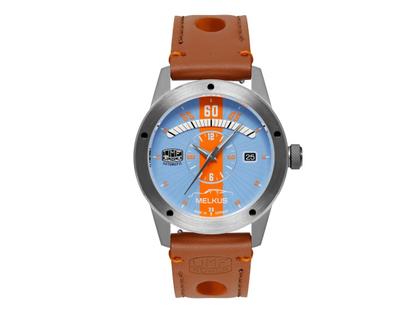 Automatikwerk Seiko NH35A, poliertes Edelstahlgehäuse im Durchmesser von 43,0 mm, verschraubte Edelstrahl-Krone, blau-orangefarbenes Zifferblatt, Datumsanzeige auf 3 Uhr, 12-Stunden-Zähler in der Mitte des Zifferblattes, silberfarbener Stunden- und Minutenzeiger mit weißer Leuchtmasse, grauer Sekundenzeiger, arabische Stunden-Indizes mit orangefarbener Leuchtmasse, Saphirglas, braunes Kalbslederband mit Racing-Lochung und Dornschließe, 10 bar wasserdicht - limitiert auf 250 Exemplare