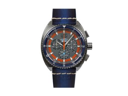 Quarzwerk Ronda 5230.D mit Alarmfunktion, Chronographenfunktion, Edelstahlgehäuse im Durchmesser von 43,0 mm, blaue drehbare Keramik-Lünette, grau-orangenes Zifferblatt, Datumsanzeige auf 4 Uhr, kleine Sekunde zwsíschen 2 und 3 Uhr, 12-Stunden-Zähler auf 6 Uhr, 30-Minuten-Zähler zwischen 9 und 10 Uhr, silberfarbener Stunden- und Minutenzeiger mit weißer Leuchtmasse, orangefarbener Sekundenzeiger, silberfarbene Indizes mit weißer Leuchtmasse, Tachymeterskala auf grauem Zifferblatt-Außenring, Saphirglas, blaues Kalbslederband mit Dornschließe, 10 bar wasserdicht - limitiert auf 499 Exemplare