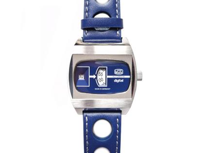 Automatikwerk UMF-Kaliber 24-34-2 mit springender Stunde (Jumping Hour), poliertes Edelstahlgehäuse im Durchmesser von 41,0 mm, dunkelblaues digitales Zifferblatt, dunkelblaues Kalbslederarmband mit Edelstahl-Dornschließe und Racing-Lochung, Saphirglas, Edelstahl-Gehäuseboden mit Saphirglas-Einsatz, 10 bar wasserdicht - limitiert auf 499 Exemplare