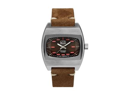 Handaufzugswerk Zaria, poliertes Edelstahlgehäuse im Durchmesser von 41,0 mm, dunkelbraunes Zifferblatt mit roten Indizes, Leuchtmasse Super-LumiNova, braunes Kalbslederarmband mit Edelstahl-Dornschließe und Schnellwechselsystem, Saphirglas, Edelstahl-Gehäuseboden mit Saphirglas-Einsatz, 5 bar wasserdicht - limitiert auf 499 Exemplare