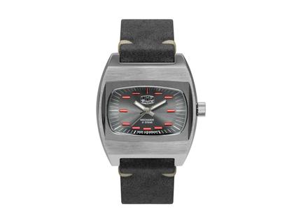 Handaufzugswerk Zaria, poliertes Edelstahlgehäuse im Durchmesser von 41,0 mm, anthrazitfarbenes Zifferblatt mit roten Indizes und Leuchtmasse Super-Luminova, graues Kalbslederarmband mit Edelstahl-Dornschließe und Schnellwechselsystem, Saphirglas, Edelstahl-Gehäuseboden mit Saphirglas-Einsatz, 5 bar wasserdicht - limitiert auf 499 Exemplare