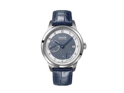 Selbstentwickeltes Handaufzugsuhrwerk, Kaliber UNG56.01, 60 Stunden Gangreserve, Edelstahlgehäuse, Durchmesser von 41,0 mm, Höhe 12,0 mm, graues Zifferblatt mit weißem Außenring, kleine Sekunde bei 9 Uhr, Datums- und Gangreserveanzeige, dunkelblaues Lederarmband mit Alligatorprägung und Faltschließe, Saphirglas, Glasboden, 10 bar wasserdicht