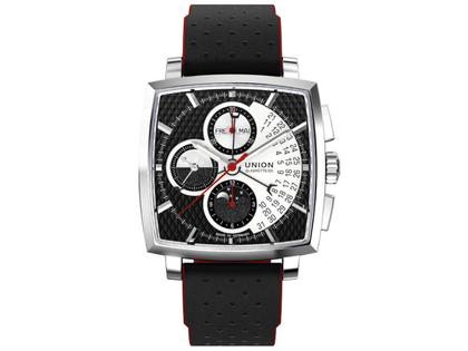 Automatik Herrenchronograph, quadratisches Edelstahlgehäuse, leicht gerundet, 41 x 41 mm, Kaliber UNG-25.S1 mit Siliziumspirale, 60 Stunden Gangreserve, Höhe 15,45 mm, schwarz-weißes Zifferblatt mit Datums- und Wochentagsanzeige (Vollkalender), Mondphase, silberne Zeiger, mit Super-LumiNova, schwarzes Lederband mit roter Unterseite und Faltschließe, Saphirglas, Saphirglasboden, 10 bar wasserdicht