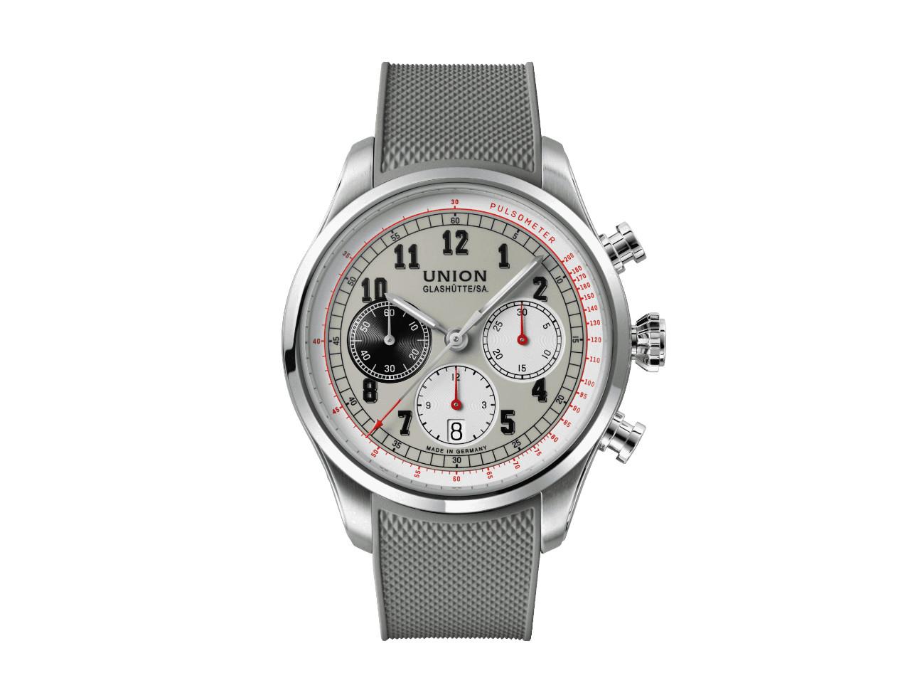 Automatikwerk Kaliber UNG-27.S1, 65 Stunden Gangreserve, Siliziumspirale, Edelstahlgehäuse poliert, Durchmesser 44,0 mm, Höhe 15,0 mm, graues Zifferblatt mit weiß-roter Tachymeter-Skala, kleine Sekunde auf 9 Uhr, Datumsanzeige, Chronograph 60 Sekunden, 30 Minuten und 12 Stunden Zähler, Sekundenstopp, Minuterie, graues Kautschukarmband mit Doppelfaltschließe, beidseitig entsiegeltes Saphirglas, Saphirglasboden, 10 bar wasserdicht