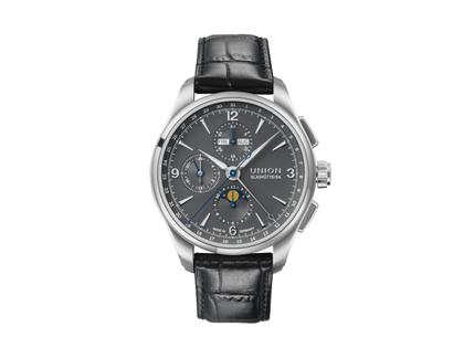 rundes Gehäuse, Durchmesser 42 mm, Edelstahl, Kaliber UNG-25.01 (in der Ausführung UNG-25.S1 mit Siliziumspirale), 65 Stunden Gangreserve, Herrenchronograph mit einem Edelstahlgehäuse im Durchmesser von 42 mm, Höhe 14,8 mm, graues Zifferblatt, silberne Zeiger und Ziffern, Vollkalender mit Wochentag, Monat und Zeigerdatum, schwarzes Krokoprint Lederband, Faltschließe, Saphirglas, Glasboden, 10 bar wasserdicht