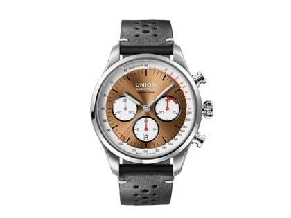 Automatikwerk UNG-27.S1 mit einer Gangreserve von 60 Stunden, Siliziumspirale, poliertes Edelstahlgehäuse im Durchmesser von 44,0 mm, Höhe 15,01, bronzefarbenes Zifferblatt, schwarze Tachymeterskala und rote Pulsometerskala auf weißem Außenring, silberfarbener Stunden- und Minutenzeiger, Sekundenzeiger mit roter Spitze, 30-Minuten-Zähler auf 3 Uhr, Datumsanzeige und 12-Stundenzähler auf 6 Uhr, kleine Sekunde auf 9 Uhr, Sekundenstopp, schwarzes Kalbslederarmband mit Racing-Lochung und Edelstahl-Doppelfaltschließe, beidseitig entsiegeltes Saphirglas, Saphirglasboden, 10 bar wasserdicht - limitiert auf 200 Exemplare