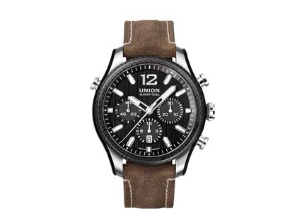 runder Herrenchronograph, Automatik, Kaliber UNG-27.S1, Siliziumspirale, 65 Stunden Gangreserve, Edelstahlgehäuse im Durchmesser von 44 mm, Höhe 15 mm, schwarzes Zifferblatt mit feinem Streifendekor, Datumsanzeige und Stoppfunktion, drei Bänder zum Wechseln: braunes Vintage-Kalbslederband, schwarzes Textilband mit weißer Naht, Kautschukband mit Carbonoptik, gewölbtes und beidseitig entspiegeltes Saphirglas, 10 bar wasserdicht