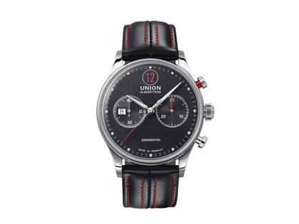 Automatik Herrenchronograph, Kaliber UNG-27.S2, Gangreserve 65 h, mit einem Edelstahlgehäuse im Durchmesser von 42 mm, Höhe 14,5 mm, schwarzes Zifferblatt mit Nietenoptik und Indizes, Stunden, Minuten, kleine Sekunde, Datumsanzeige im Zifferblattfenster, Chronograph 60 Sekunden 30 Minuten Zähler, Minuterie, schwarzes Kalbslederband mit markanter Doppelnahtund Doppel-Faltschließe, beidseitig entspiegeltes Saphirglas, 10 bar wasserdicht