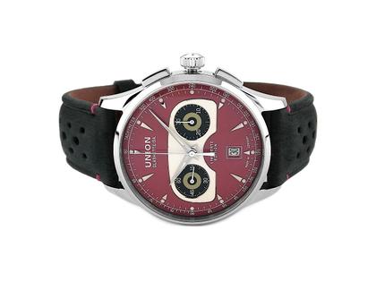 Automatikwerk Kaliber UNG-27.02, Chronograph, 60 Stunden Gangreserve, Edelstahlgehäuse, Durchmesser 42,0 mm, Höhe 15,0 mm, zinnoberrotes Zifferblatt mit Designelementen aus dem Amaturenbrett des 1000 SP von Autounion, Anzeige von Stunden, Minuten, kleine Sekunde, Datumsanzeige im Zifferblattfenster, 60 Sekunden und 30 Minuten Zähler, Minuterie, Tachymeterskala, schwarzes Lederarmband mit Lochmuster und Doppel-Faltschließe, beidseitig entspiegeltes Saphirglas, Glasboden, 10 bar wasserdicht