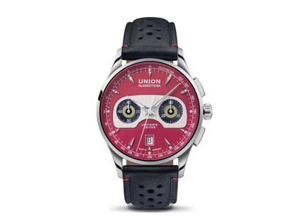 Automatik Herrenchronograph, Kaliber UNG-27.02, Gangreserve 60 h, mit einem Edelstahlgehäuse im Durchmesser von 42 mm, Höhe 15 mm, rotes Zifferblatt mit Designelementen aus dem Amaturenbrett des 1000 SP von Autounion, Anzeige von Stunden, Minuten, kleine Sekunde, Datumsanzeige im Zifferblattfenster, Chronograph 60 Sekunden und 30 Minuten Zähler, Minuterie, Tachymeterskala, dunkelgraues Lederband mit Lochmuster und Doppel-Faltschließe, beidseitig entspiegeltes Saphirglas, 10 bar wasserdicht
