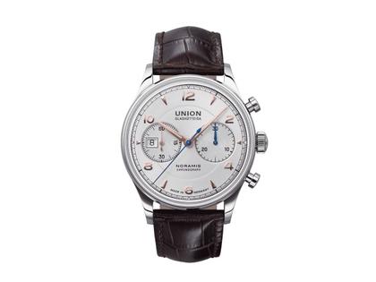 Union Glashütte Noramis Chronograph mit silbernem Zifferblatt und goldenen Indizes, braunes Lederband