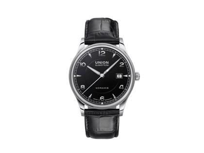 Union Glashütte Noramis Datum Automatik Edelstahl 40mm schwarzes Zifferblatt schwarzes Lederband